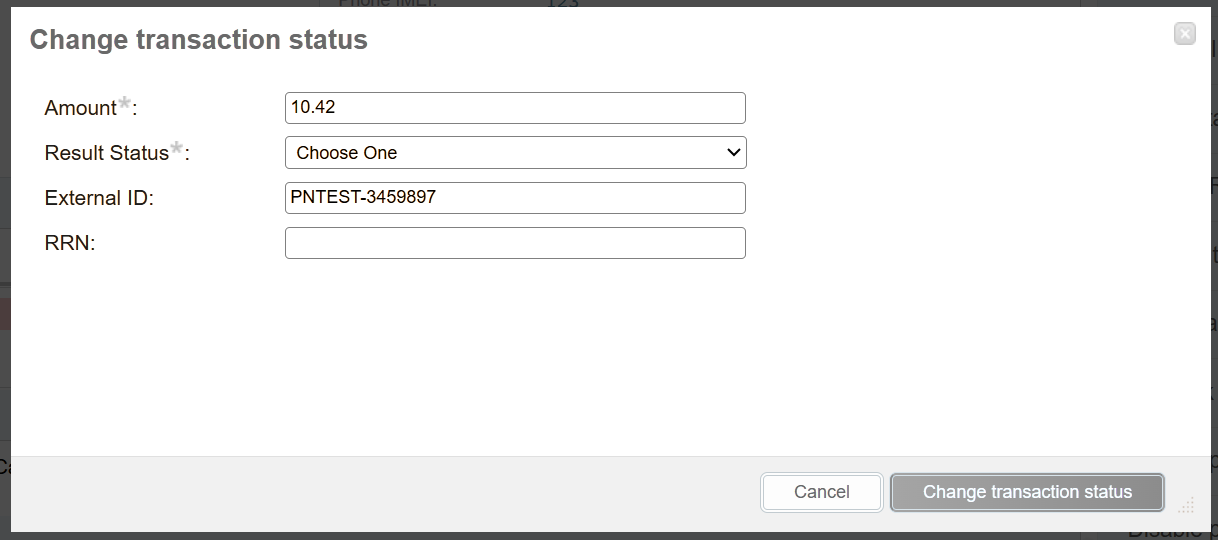 In the Amount field the order’s amount can be changed. In the Result Status field a order’s status (DECLINED/APPROVED) should be choosed. In the External ID field External Order ID can be changed. In the RRN field a retrieval reference number of the transaction can be added.