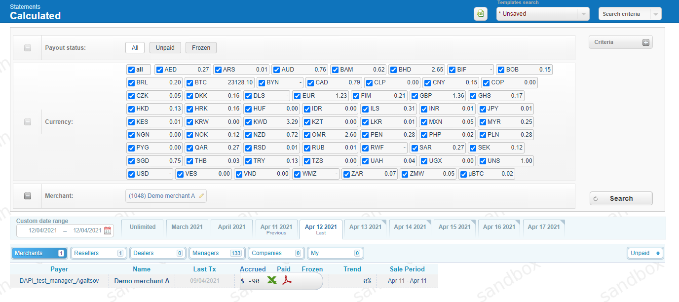 The statements are viewed in “Reports” – “Statements”. On this screen, statements can be sorted by currencies, merchants, resellers and dealers, as well as by the payment status (“All”, “Frozen”, “Not paid”) and date range. Using the date range, you can select the date of the statement that you want to upload.