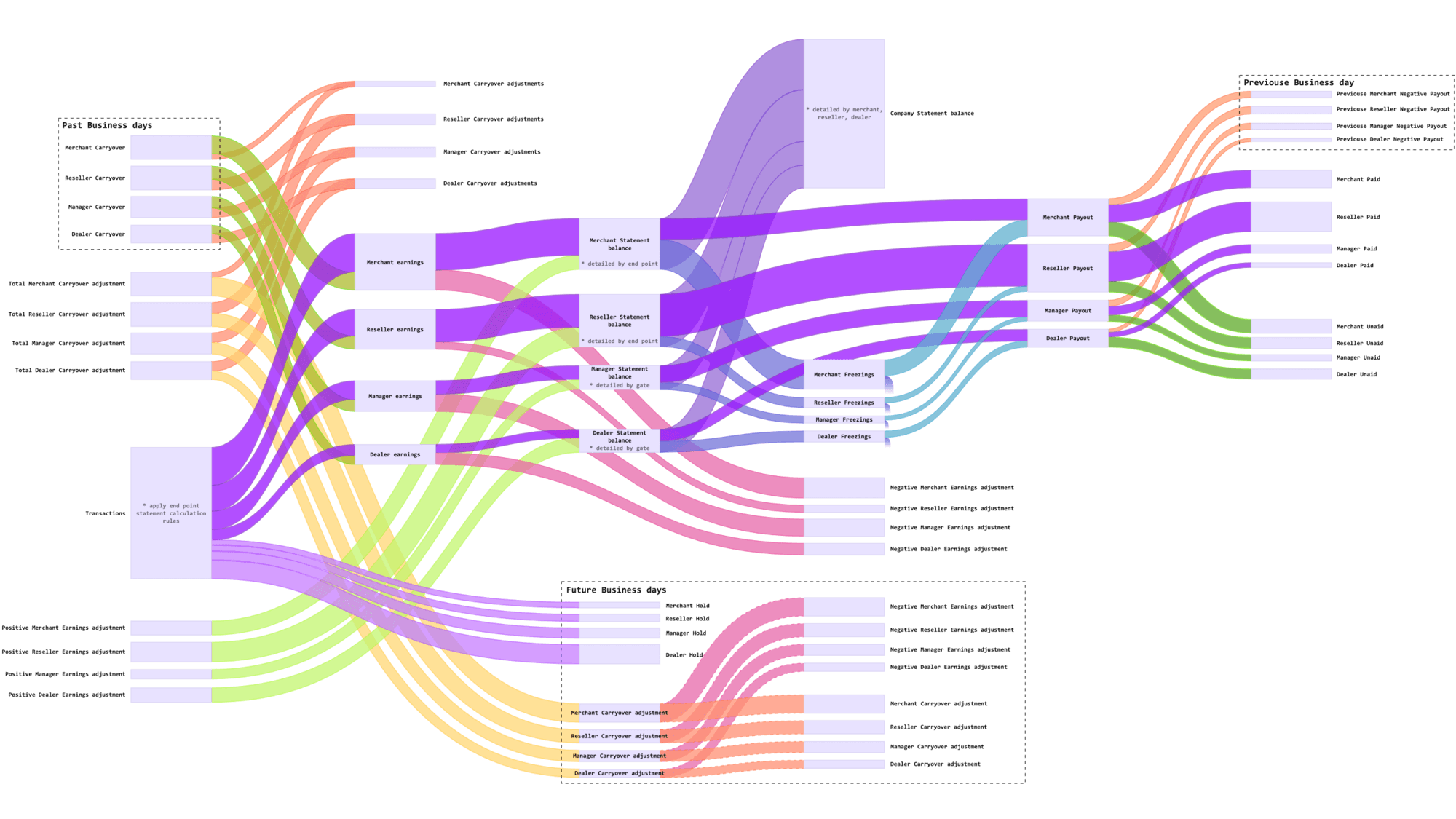 merchant statements are generated, merchant statements are detailed by terminals, indicating the reseller; adjustments are applied to the carryover paid to the merchant from the reseller or manager in his absence; earnings adjustments are accrued; the final balance of the current period is calculated as: the difference between the reseller (manager) and merchant transaction commissions applied; in the final, the reseller (manager) carryover is added minus the carryover adjustments and the amount of the merchant’s transactions excluding the amount of service operations and a Money Transfer type operation,