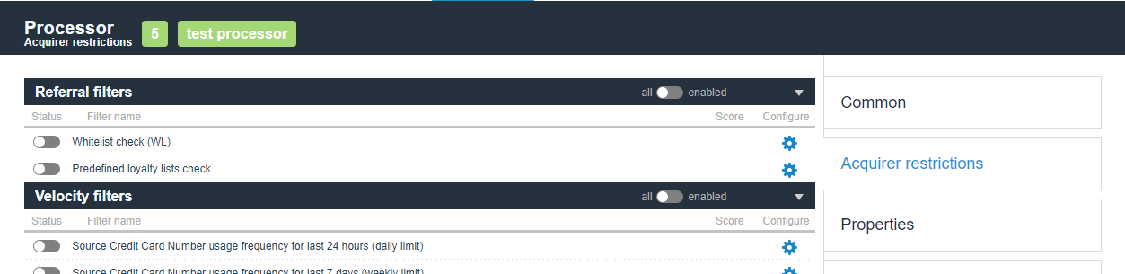 The filter allows locking out a Processor for Lockout period of time based on the defined Limit of declined transactions with the specific Analyzed decline codes occured for the Analyzed period of time. Once the filter is activated one can track the filter lockout activities in the Processor Logs screen. When the filter is disabled it resets current status of the Processor to unblocked despite the Lockout period remaining time. Processor logs screen is enabled by request.