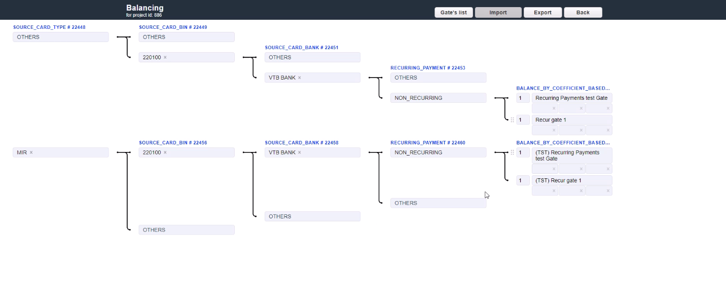 The routing & balancing system allows to distribute traffic between payment gates flexibly depending on the defined criteria and customer’s transaction data. Traffic can be routed to a specific group of gates/processors and distributed between them in accordance with the specified balancing. The balancing is configured on the system Project level in the Routing & Balancing tab.