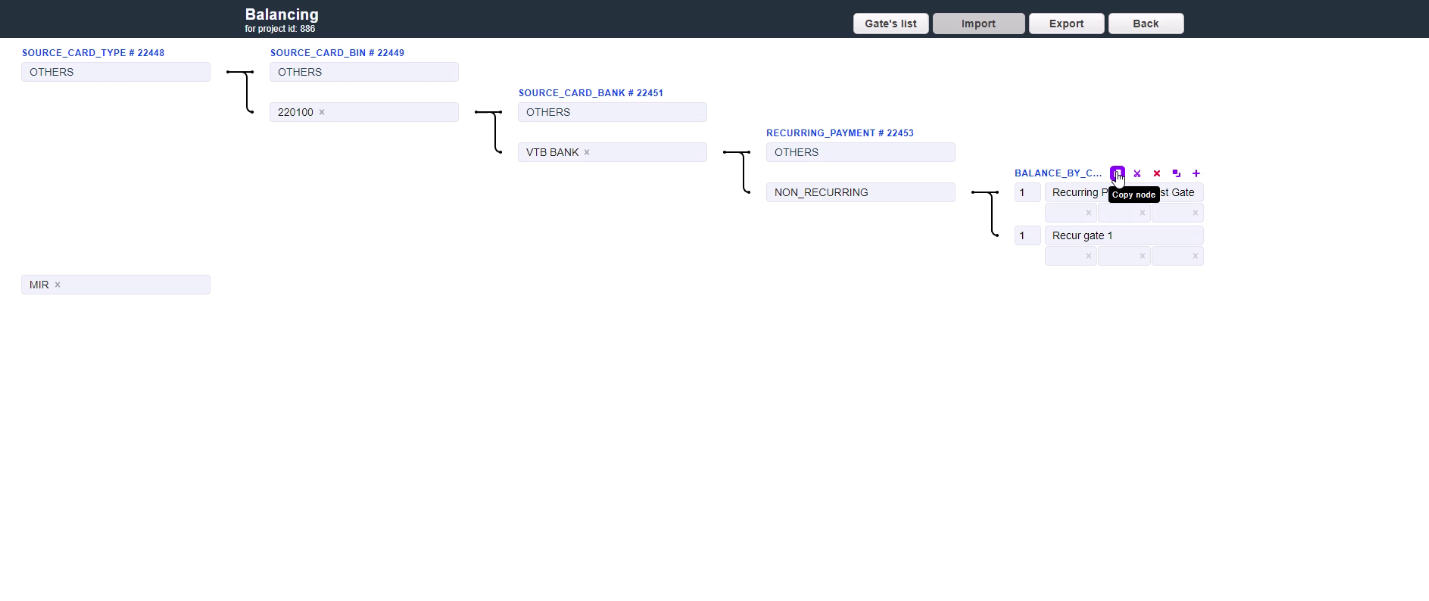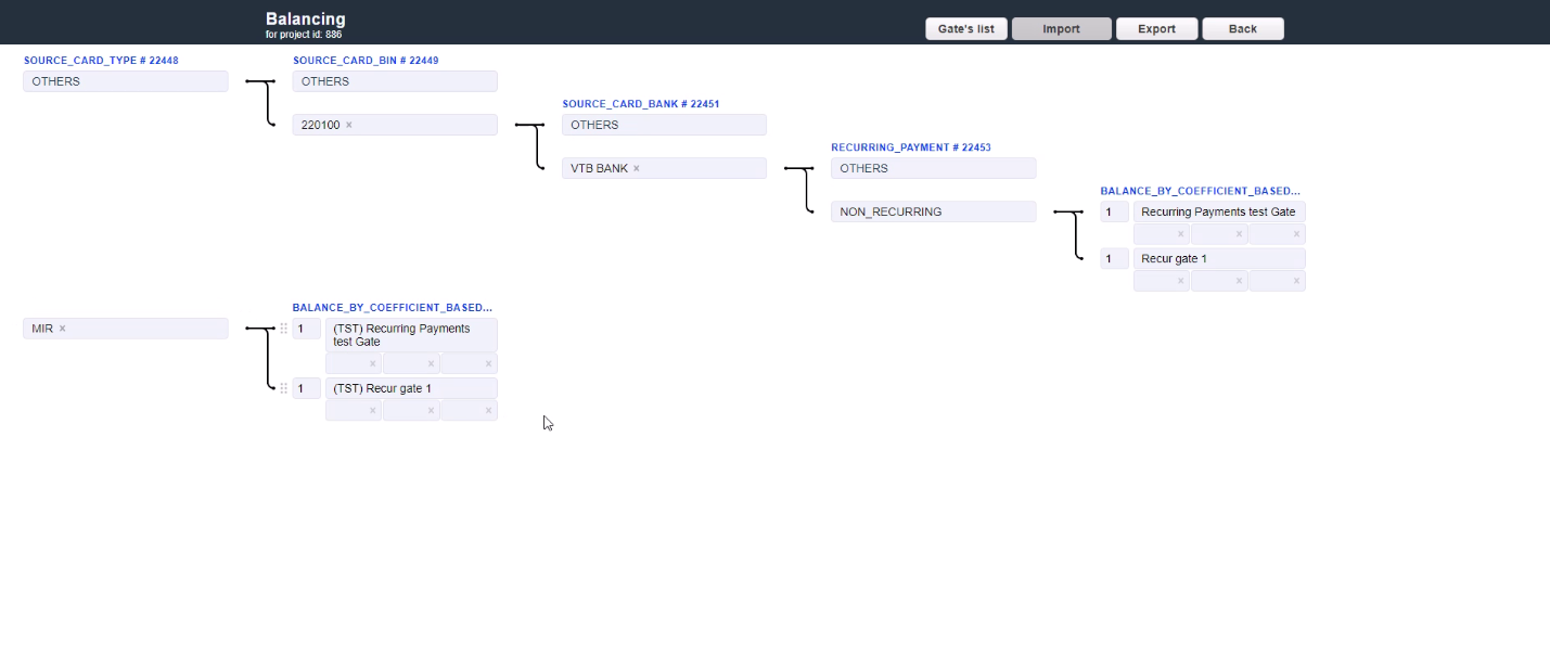 For example, 3 gates have 20%, 30% and 50% coefficients set for them. In this case, the gate with 50% coefficient has the 50% probability of becoming the first gate in the formed chain. If for some reason the first gate in chain was unable to process the transaction, it goes to the next gate in chain. If the second gate was not able to process the transaction as well, it moves on until one of the subsequent gates in chain processes it. The traffic will try to reach the distribution between the gates according to their coefficients based on the quantity of transactions.