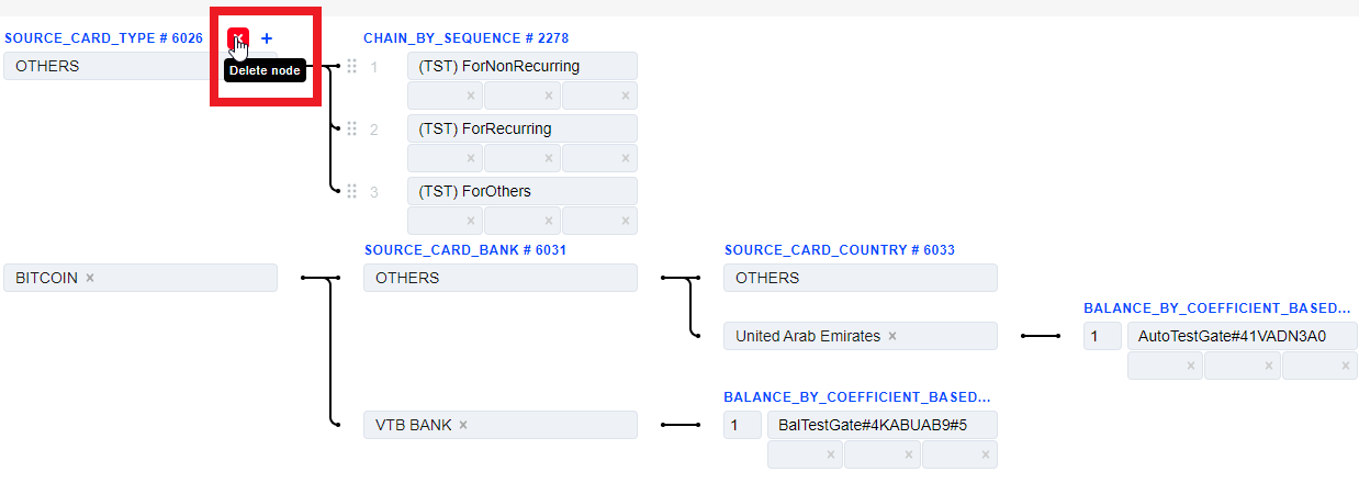 Blocks are connected by arrows to improve the visual presentation. An arrow is directed from a certain routing option to the block created from it. If the transaction parameters match the specified routing option, it is forwarded further along the arrow.