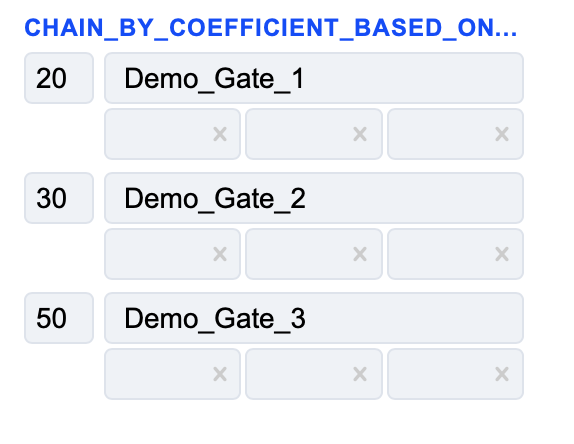 Chain by Coefficient Based on Tx Count allows to sort transactions by gates using the specified probability percentage and the chain principle. If the incoming transaction is going to be filtered or exceed the limits on some gates, the balancing algorithm excludes these gates and then it forms the chain with the remaining ones according to their coefficients.
