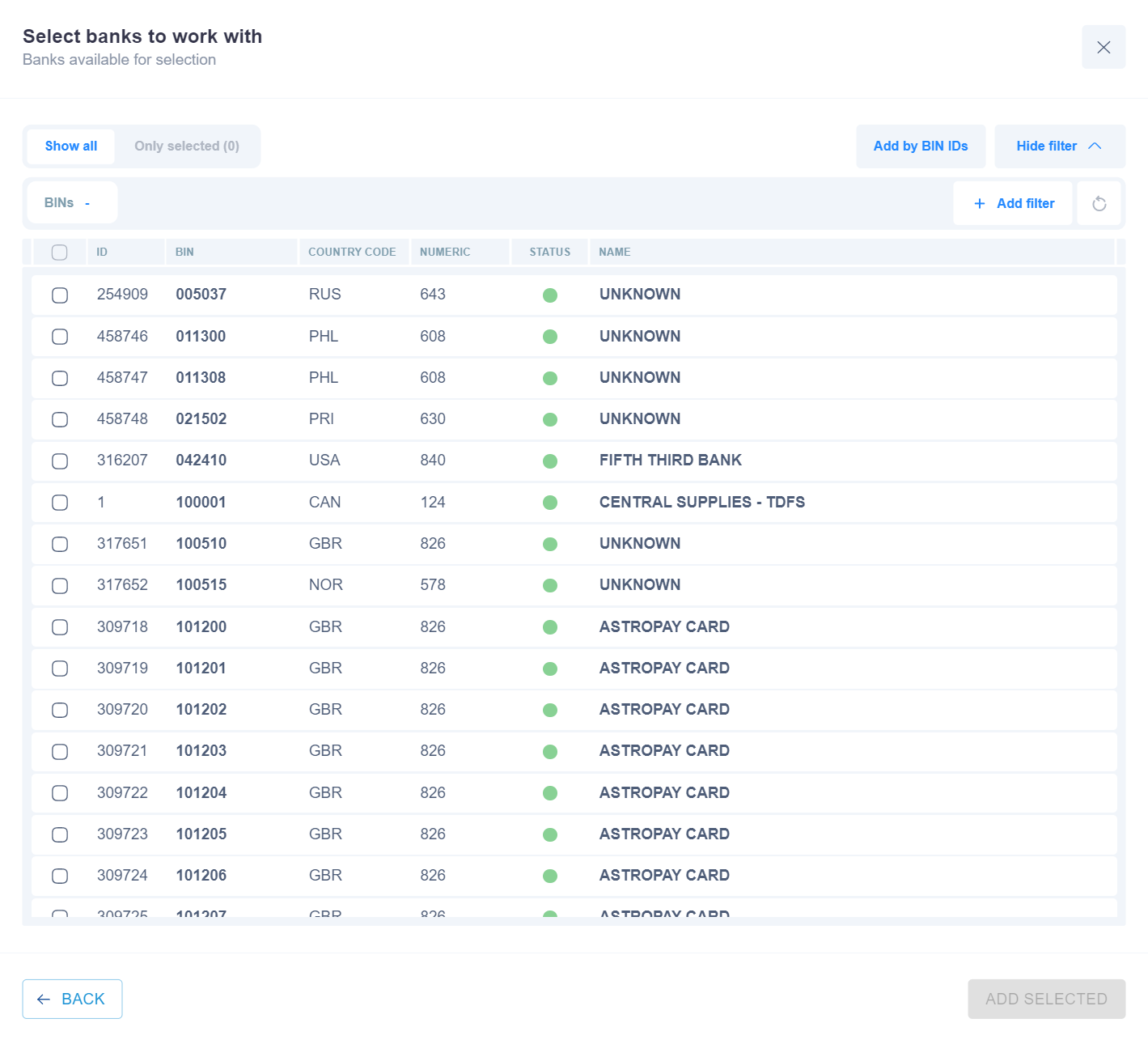 2) The Card Range routing type allows to sort transactions by the receiver’s card BIN value. Specify bin and choose the needed BIN range of the receiver and build a further route based on it. Several BIN ranges can be found for the specified BIN value. Select the one with lower priority. There is an option to search cards by their BINs. System can search for up to 500 entered card BINs listed one after another and separated by commas. They can be chosen by pressing the “BINs -” button.
