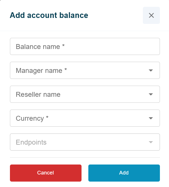 To add new account balance press +Add button in account balances field and set up balance and manager name and currency. Detailed setting of account balance is described below in this section.