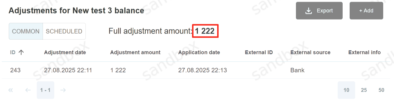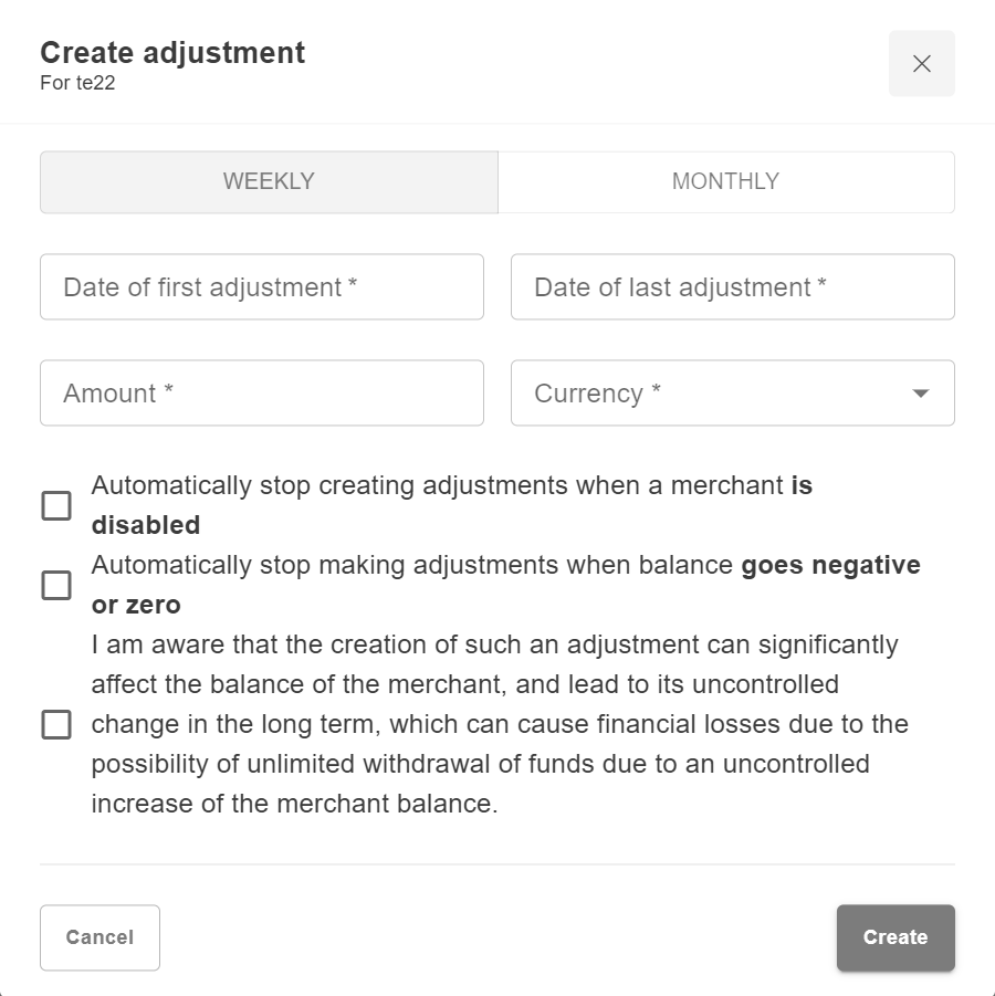 I am aware that the creation of such an adjustment can significantly affect the balance of the merchant, and lead to its uncontrolled change in the long term, which can cause financial losses due to the possibility of unlimited withdrawal of funds due to an uncontrolled increase of the merchant balance. This checkbox is mandatory