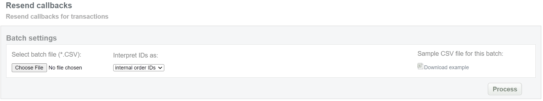 This batch operation can be useful if information on the final status of transactions is available in SecurePay system and for some reason is not available in the Connecting Party system. Collect the order IDs, assigned by SecurePay system to the CSV file and upload it to send new callback notifications. An example of CSV file for upload is available on the same screen.