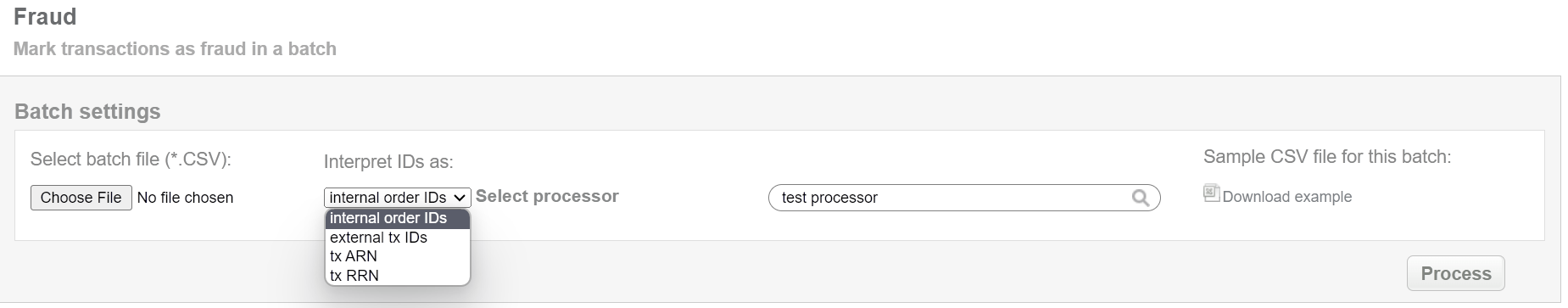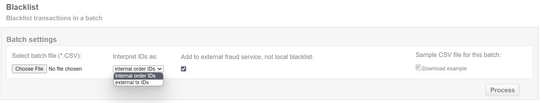 This batch operation, in according to specified input, puts cards in blacklist or external fraud system if such is set up. Collect the order IDs, assigned by SecurePay system to the CSV file and upload it to blacklist card of selected transactions. An example of CSV file for upload is available on the same screen.