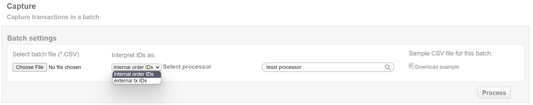 This batch operation can be useful for deducting the locked amount from preauth transactions (preauth should be in approved final status) in according to specified input. Collect the order IDs, assigned by SecurePay system to the CSV file and upload it to make capture of selected transactions. An example of CSV file for upload is available on the same screen.
