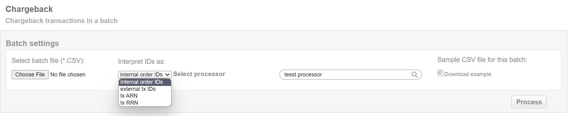This batch operation can be useful if for some reason reversal was not made to prevent a chargeback and creating chargeback transaction according to specified input is needed. Collect the order IDs, assigned by SecurePay system to the CSV file and upload it to make chargebacks for selected transactions. An example of CSV file for upload is available on the same screen.