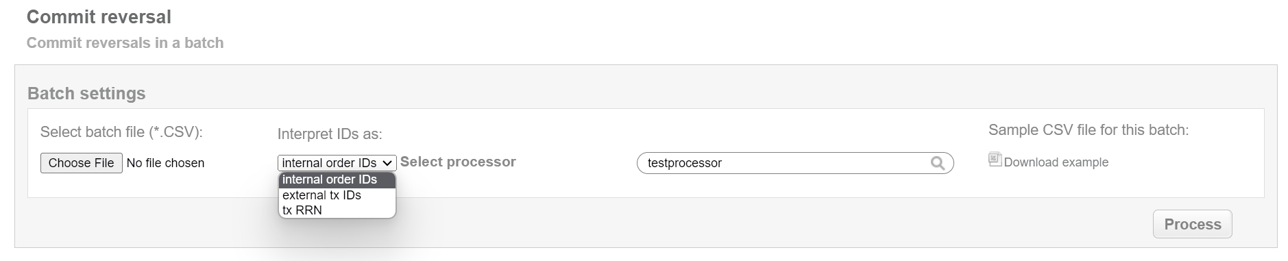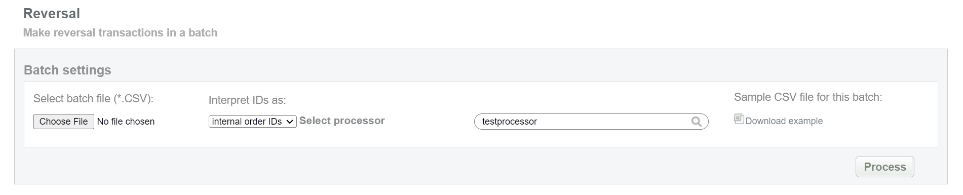 This batch operation can be useful for initiating reversal transactions in according to specified input. Collect the order IDs, assigned by SecurePay system to the CSV file and upload it to make reversal of selected transactions. An example of CSV file for upload is available on the same screen.