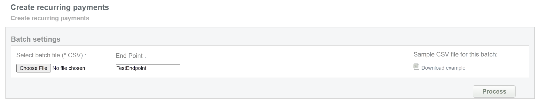 This batch operation can be useful for initiating recurring payments for transactions that require regular debits with the same data. Collect the order IDs, assigned by SecurePay system and enter all information to the CSV file and upload it to create recurring payments. An example of CSV file for upload is available on the same screen.