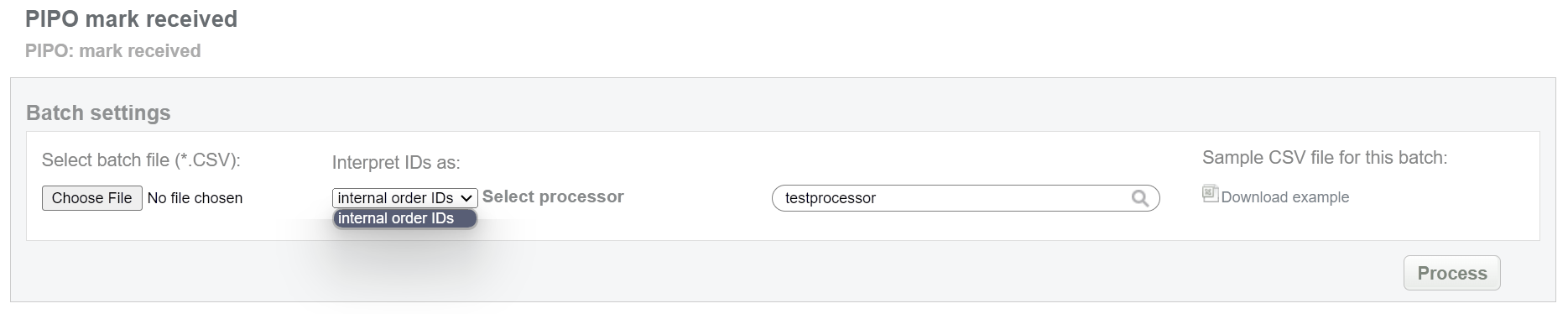 This batch allows to mark pending bank transfer as received. This status equals to “approved” for preauth transaction. Collect order IDs, assigned by SecurePay system and enter all information to the CSV file and upload it to mark PIPO payments as received. An example of CSV file for upload is available on the same screen.