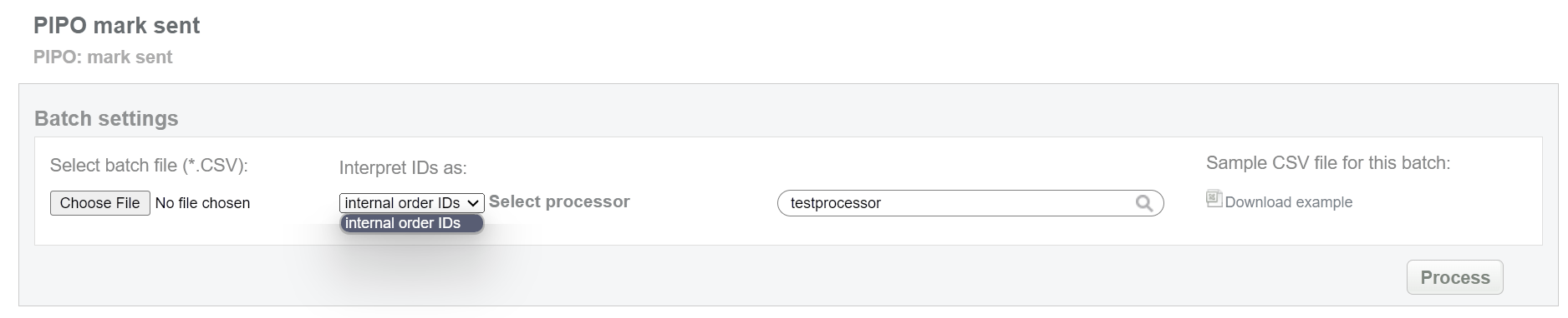 This batch operation allows to mark pending bank transfer as sent (but not received yet). This status equals to “processing” for preauth transaction. Collect order IDs, assigned by SecurePay system and enter all information to the CSV file and upload it to mark PIPO payments as sent. An example of CSV file for upload is available on the same screen.