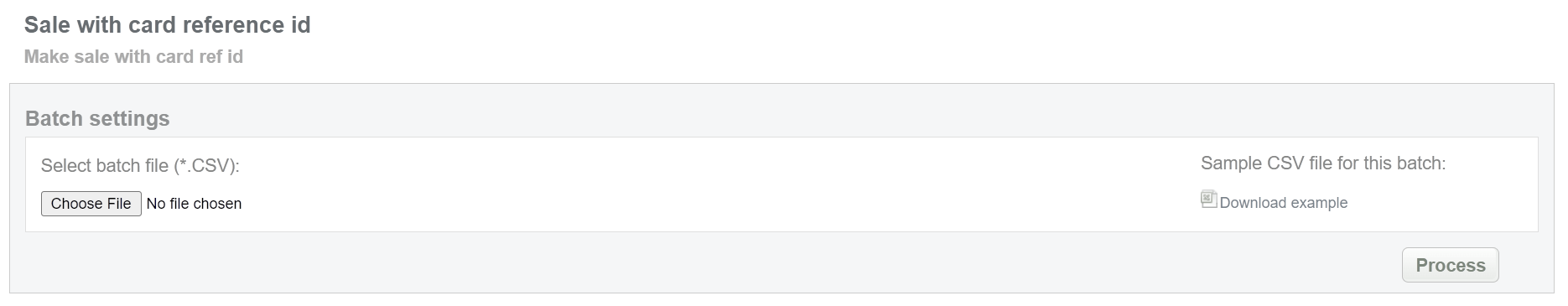 This batch operation can be useful for initiating sale without any card information using only card reference ID. Collect the Endpoint and Card reference IDs, assigned by SecurePay system and enter all information to the CSV file and upload it to initiate sale transactions with card reference ID. An example of CSV file for upload is available on the same screen.
