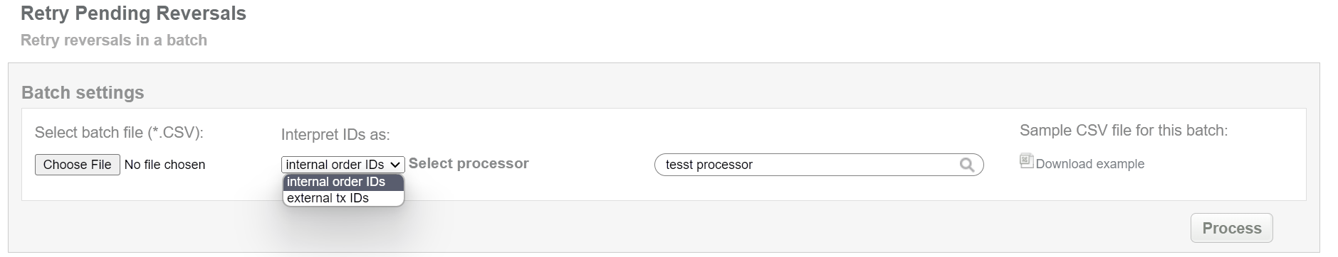 This batch operation re-sends reversal request for pending reversals in according to specified input. Collect the order IDs, assigned by SecurePay system to the CSV file and upload it to make reversal of selected transactions. An example of CSV file for upload is available on the same screen.