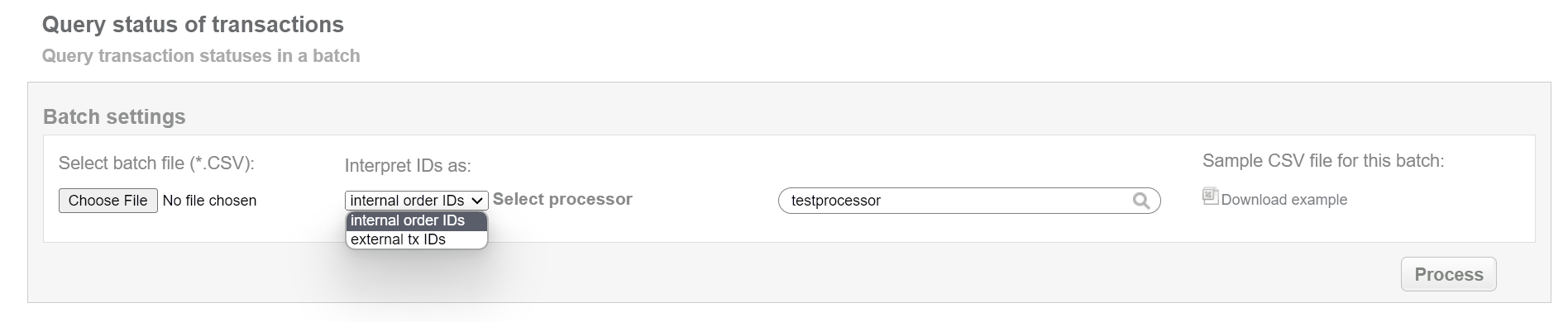 This batch operation can be useful for requesting status of transactions (doesn’t matter in what status) in according to specified input. Collect the order IDs, assigned by SecurePay system to the CSV file and upload it to request status of the selected transactions. An example of CSV file for upload is available on the same screen.