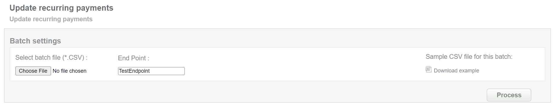 This batch operation can be useful for updating recurring payments (new customer data and etc.) for transactions that require regular debits with the same data. Collect the recurring order IDs, assigned by SecurePay system and enter all information to the CSV file and upload it to update recurring payments information. An example of CSV file for upload is available on the same screen.