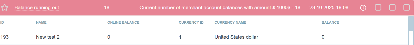 This alert is used if necessary to receive notification when the Merchant Live balance is equal or under 1000$.
