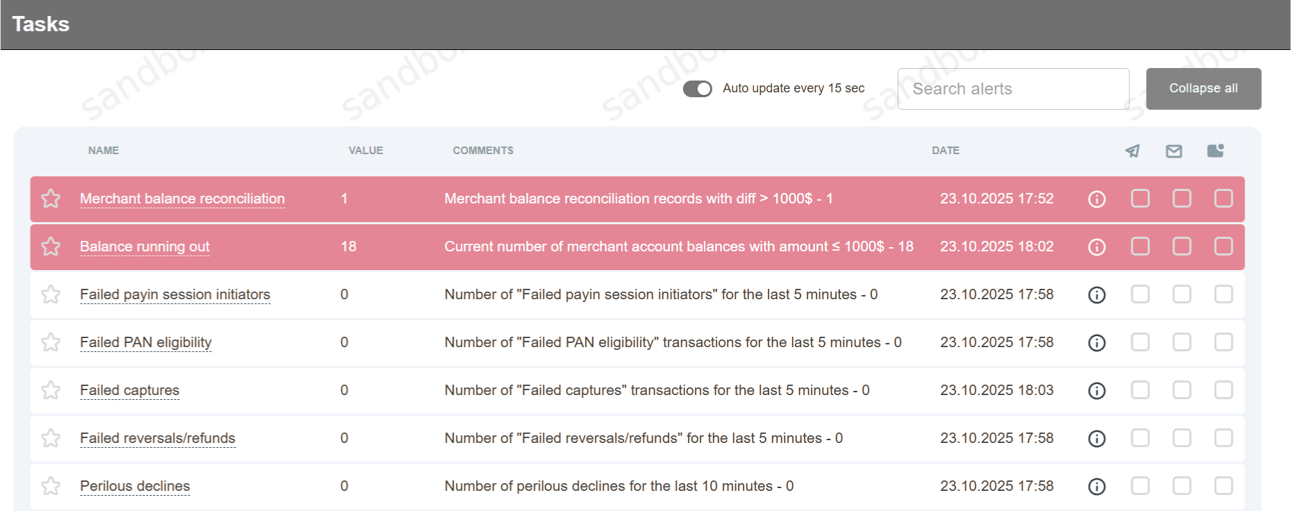 The screen is located in “Tools” – “Monitoring” section. This screen displays information about various errors that usually require quick response, as well as the options to subscribe for notifications about any errors via Telegram, Email or Push notification. Phone number and e-mail address are taken from the personal account (Manager or its employee account).