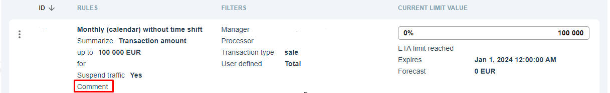 Suspend traffic - just yes or no. What to do with transactions when limit reached: stop traffic or not;