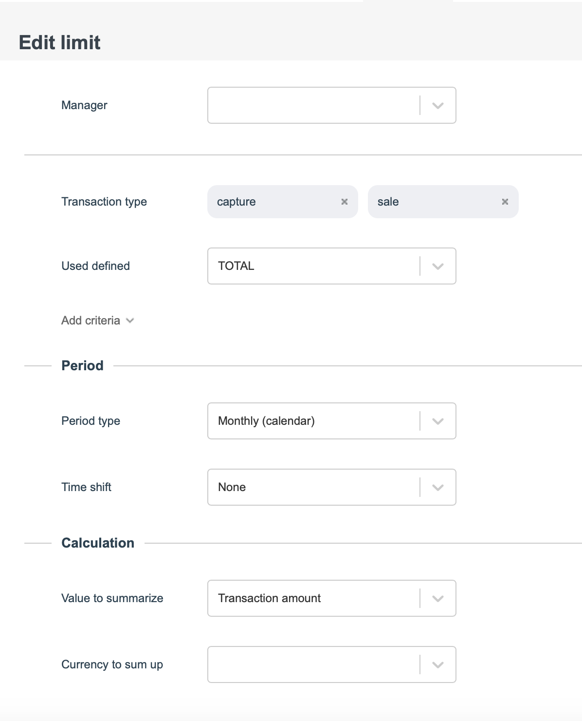 Limit value - For Amount enter total transaction amount or transaction count for this limit. Limit doesn’t include settled value, if limit should be 15000 for it to be included value must be 15000.01. Range to make the limit amount less transparent.