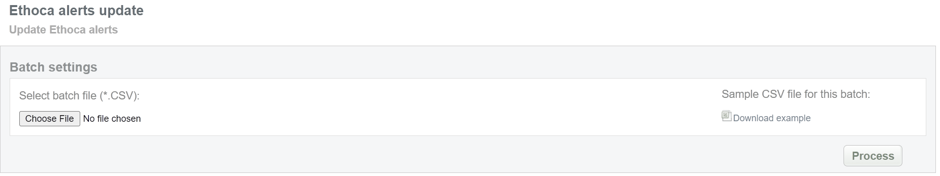 This batch operation can be useful for updating Ethoca statuses. Collect the order IDs, assigned by SecurePay system to the CSV file and upload it to send statuses to Ethoca system. An example of CSV file for upload is available on the same screen.